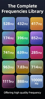 Au cœur de Frequency, explorez une symphonie de fréquences Solfège, chacune minutieusement sélectionnée pour ses vertus spécifiques. Du soulagement des tensions et de l'amélioration de la concentration avec le 174 Hz, à la réparation tissulaire et cellulaire permise par le 285 Hz, l'application vous accompagne. Le 396 Hz est votre allié pour dissiper la culpabilité et la peur, tandis que le 417 Hz favorise l'élimination des énergies négatives et l'émergence de nouveaux départs. Plongez dans la sérénité du 432 Hz, ou embrassez la transformation profonde du 528 Hz, souvent associée à la guérison et à la réparation. Renforcez vos connexions interpersonnelles avec le 639 Hz, éveille votre intuition grâce au 741 Hz, réalignez votre esprit avec le 852 Hz, et visez l'unité et la conscience supérieure avec le majestueux 963 Hz.