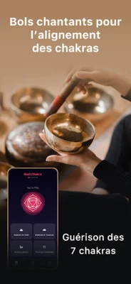 Chakra Healing propose un éventail riche de méditations guidées, minutieusement conçues pour activer et équilibrer chaque chakra, de Muladhara (chakra racine, 396 Hz) à Sahasrara (chakra couronne, 963 Hz), en explorant leurs couleurs vibratoires et leurs fonctions. Pour une immersion accrue, intégrez des battements binauraux (Delta, Thêta, Alpha, Bêta, Gamma) qui facilitent le sommeil profond, la relaxation, la concentration ou la cognition avancée. Les sons purificateurs des bols chantants tibétains sont également à votre disposition pour harmoniser vos énergies et réduire le stress. Complétez votre voyage avec notre générateur de paysages sonores, superposant des éléments naturels comme les cascades apaisantes ou les vagues de l'océan sur des mélodies envoûtantes, créant ainsi l'ambiance parfaite pour votre pratique.